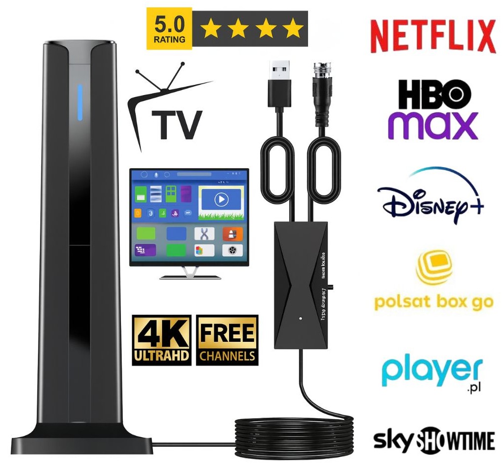 Dzięki współpracy z oficjalnymi dostawcami treści TV i VOD, udostępniamy tylko 50 sztuk w symbolicznej cenie. Z tą anteną uzyskasz dostęp do głównych kanałów krajowych oraz treści emitowanych na Netflix, HBO Max, Disney+, Polsat Box Go, Player.pl, SkyShowtime – wszystko bez abonamentu, ukrytych kosztów czy dostępu do Internetu. To wyjątkowa okazja tylko dla pierwszych 50 osób.