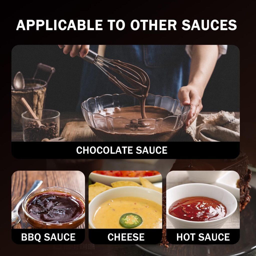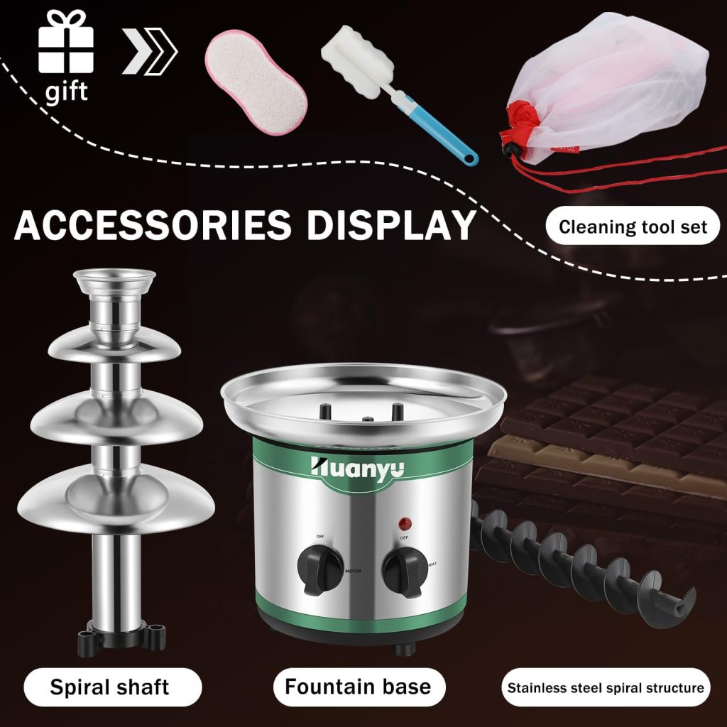 Součástí sady je kompletní příslušenství pro snadné používání i čištění: nerezová základna, spirálová osa, nástavce a čisticí pomůcky – vše připravené pro dokonalý čokoládový zážitek.