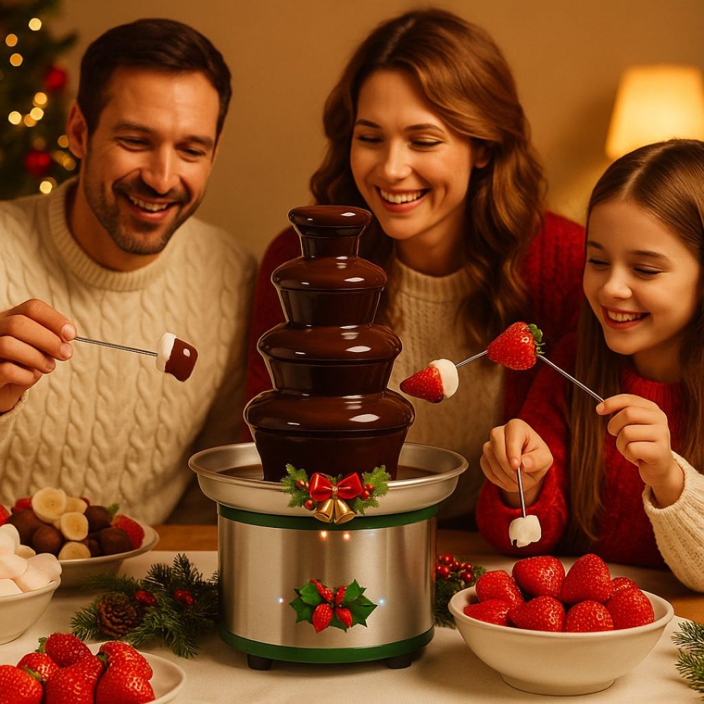 Čokoládová fontána se stane srdcem vašich Vánoc – místem, kde se setkává rodina, láska a sladká chuť radosti.