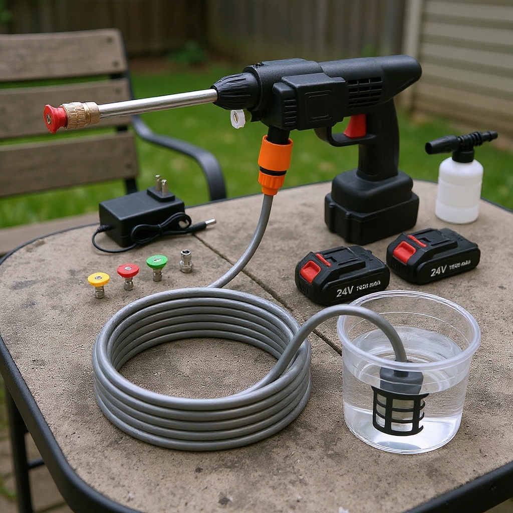 ✅ Kompletny zestaw – 2 baterie, wąż 5m, dysze, butelka
