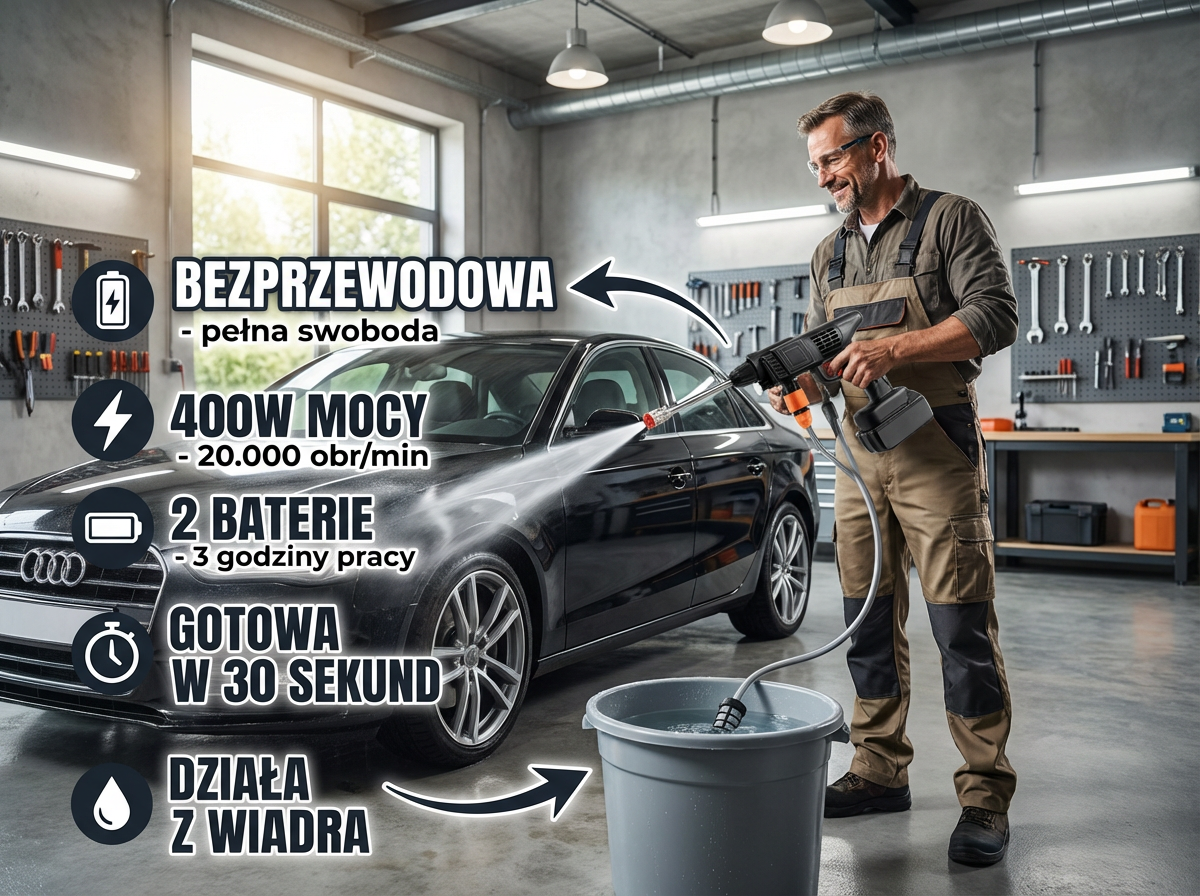 400W silnik + 20.000 obr/min = siła usuwania każdego brudu. Błoto, tłuszcz, kurz – wszystko znika w sekundach. To nie zabawka, to profesjonalne narzędzie!
