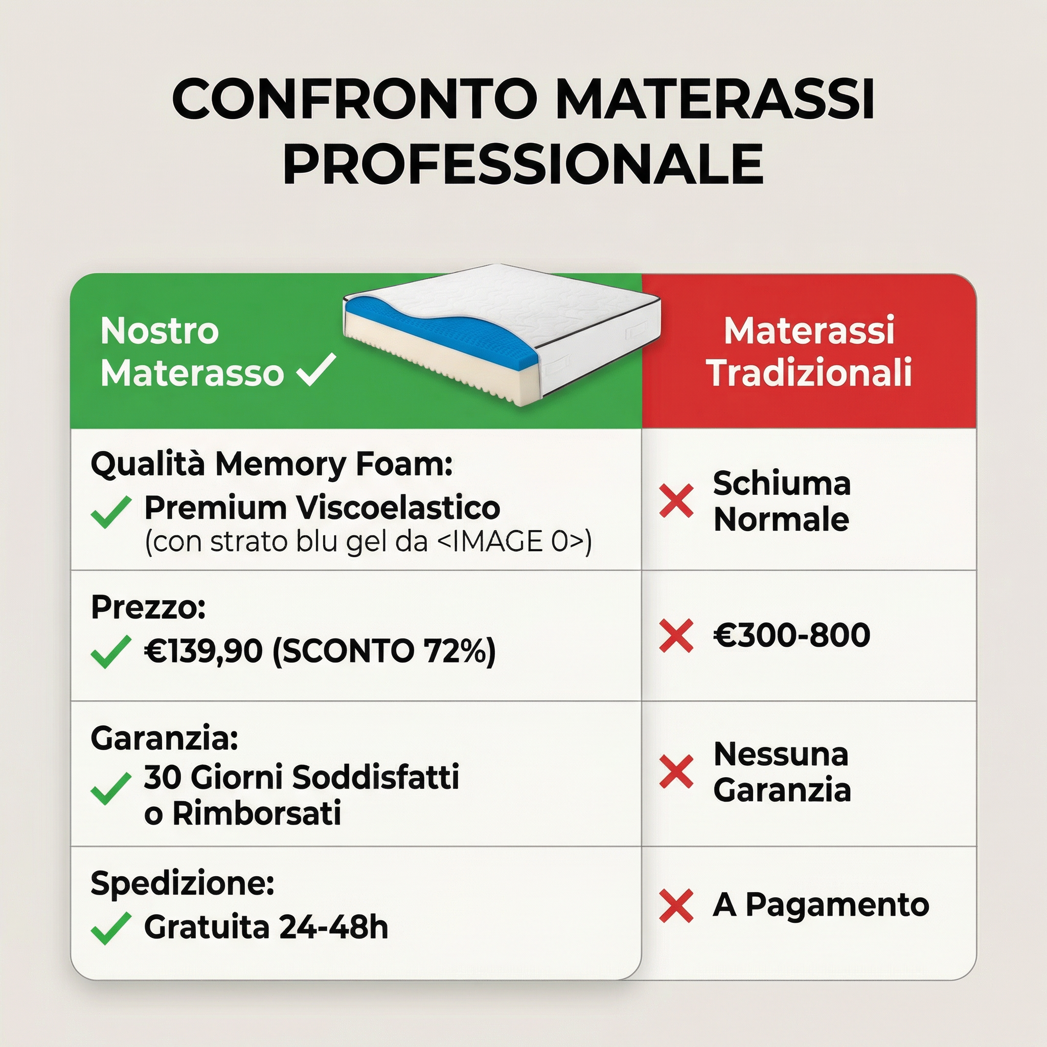 | Qualità Memory Foam | ✓ Premium Viscoelastico | ✗ Schiuma Normale |
