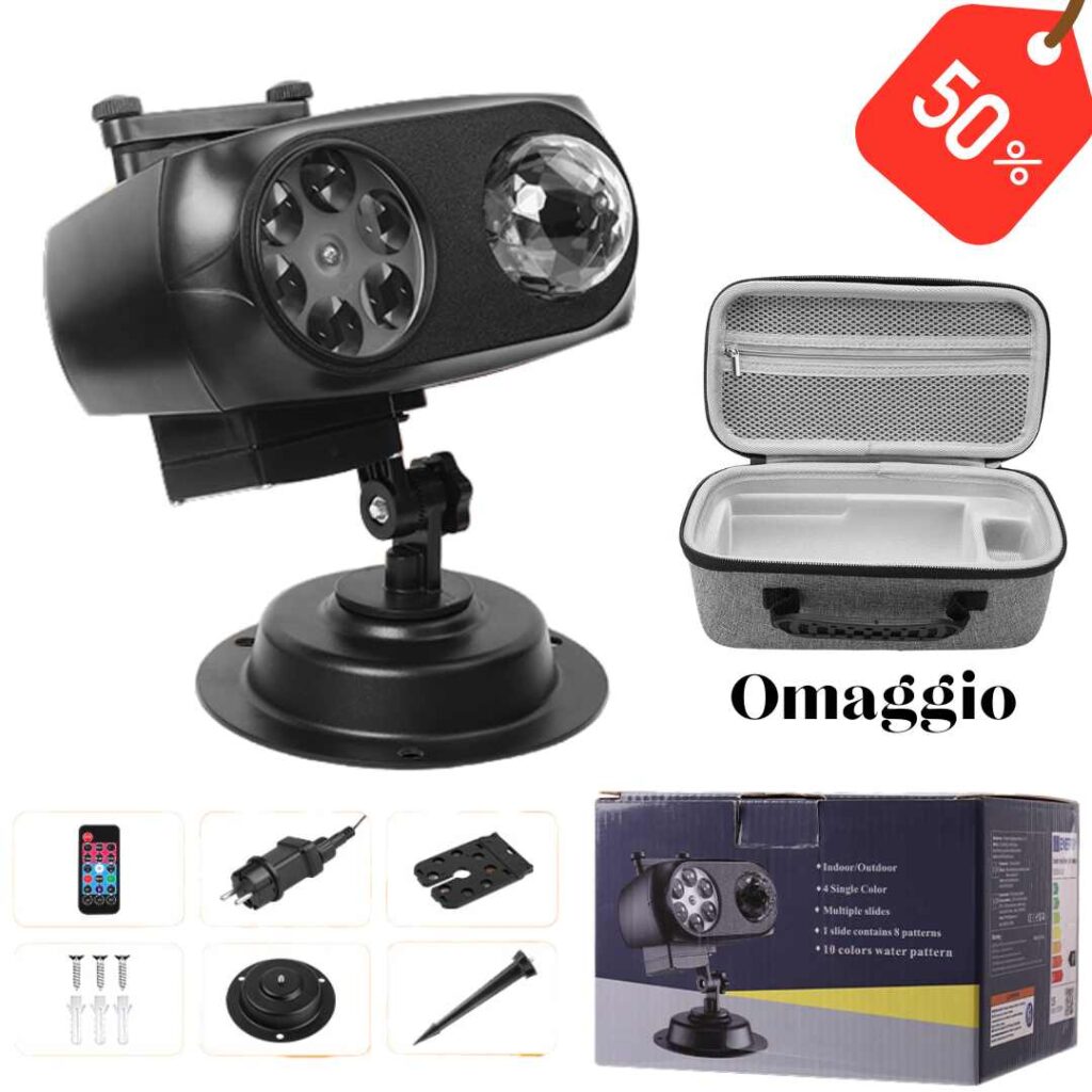 Παρουσιάζεται σε ένα χυτευμένο κουτί από χαρτόνι, θα βρούμε τον προβολέα, ο οποίος είναι σαφώς ογκώδης, μια τσάντα με δεκάδες θεματικά έγχρωμα γραφικά (Απόκριες, Χριστούγεννα, γενέθλια κ.λπ.), μια βάση, έναν πάσσαλο γείωσης, βίδες με βύσματα, ένα τηλεχειριστήριο και οδηγίες.