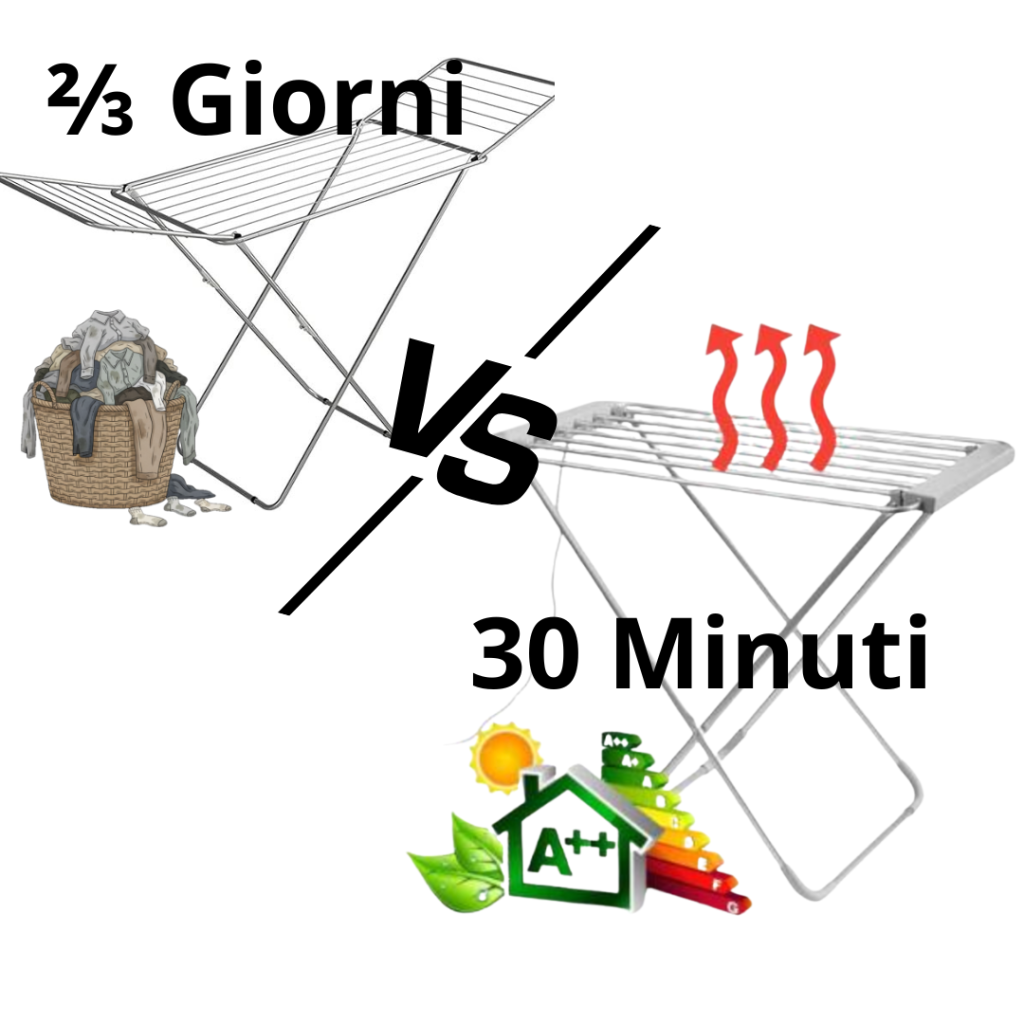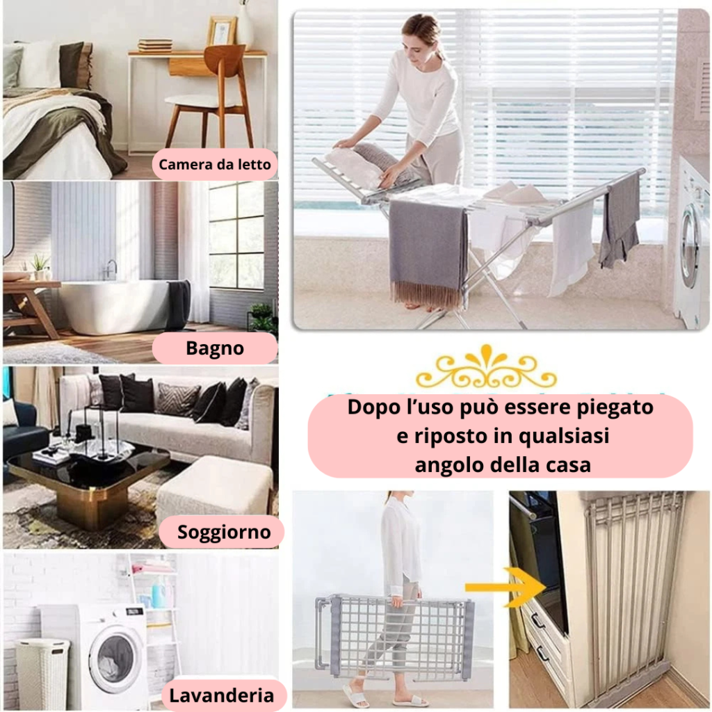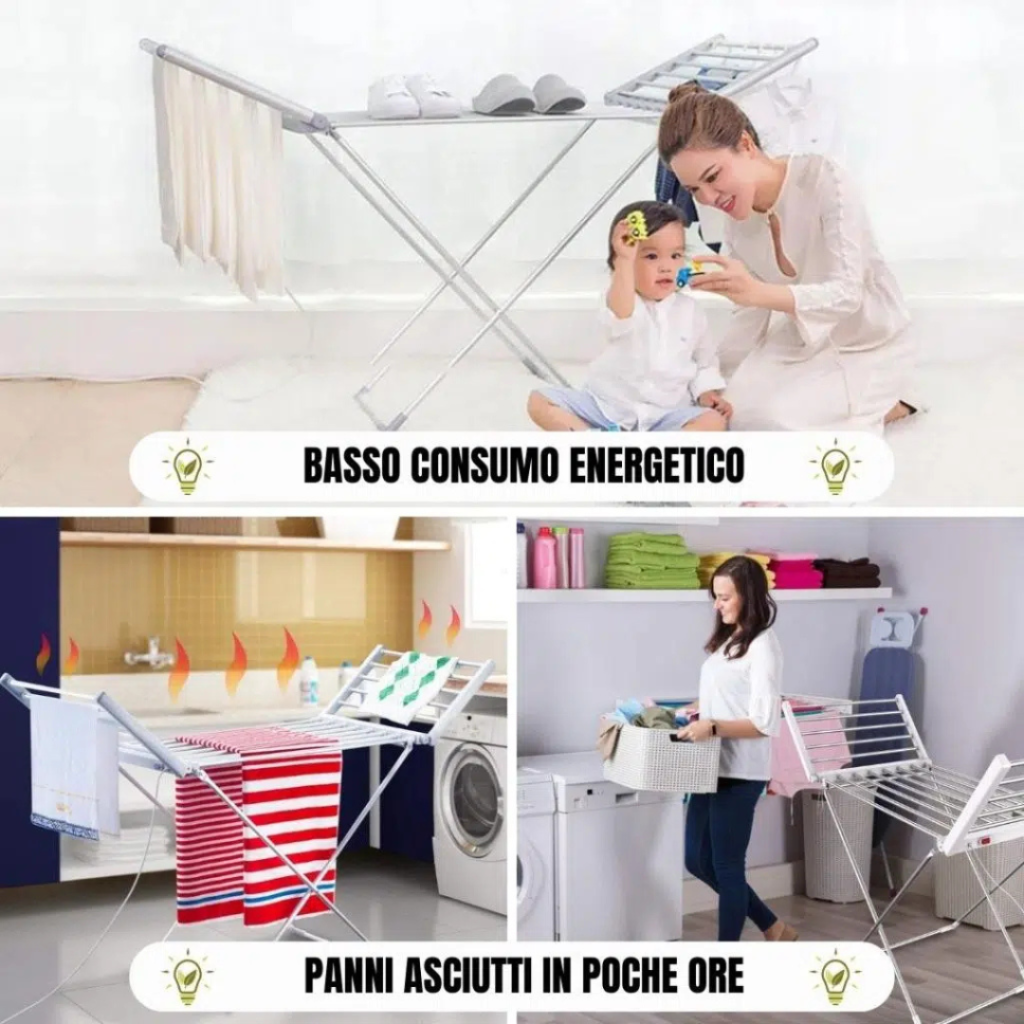 Apri lo stendino, collegalo alla presa elettrica e inizi subito ad asciugare il bucato.