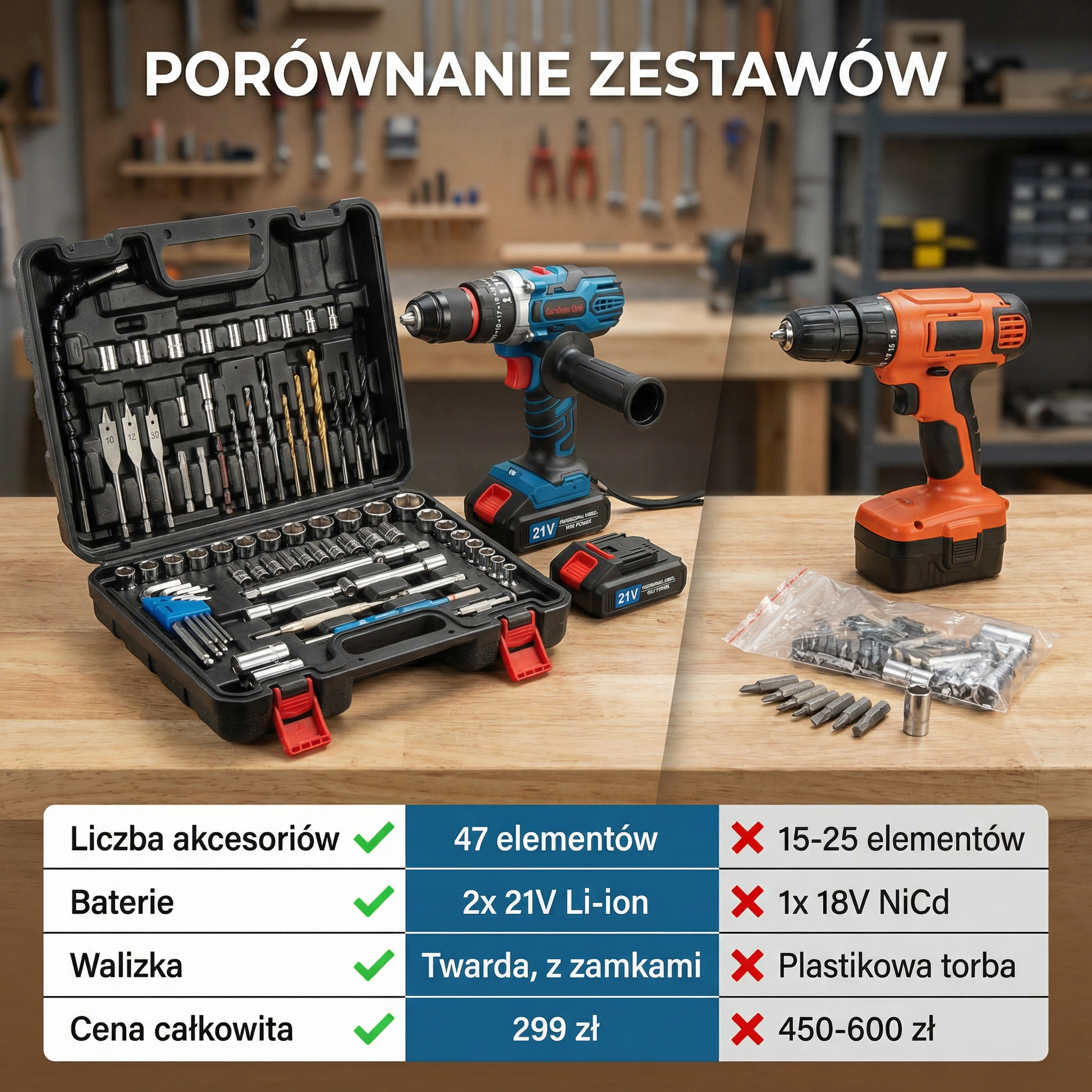 Kupowanie osobno: wiertarka (150 zł) + wiertła (80 zł) + klucze (60 zł) + akcesoria (200 zł) = 490 zł. Nasz zestaw: 299 zł. Zyskujesz więcej za mniej.